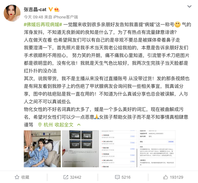对此,有名为@张吉晶-cat的微博用户今日发布微博,解释称,网上流传的“病媛”照片是她手术当天她的老公拍的,本意是告诉亲朋好友们手术很顺利不用担心,并且没有化妆,该博主还表示她本人从没带过货。此外,该博主还表示会对此事进行维权。