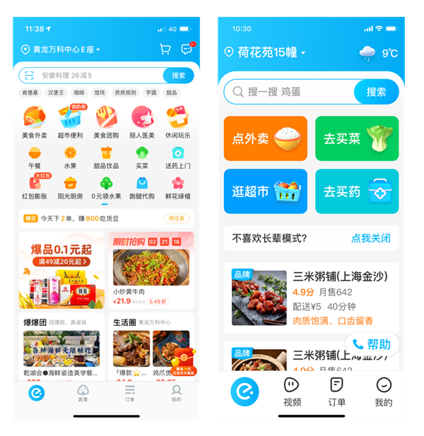 据了解,除了简化界面、增大字体外,长辈模式精选了契合老年人日常生活需求的四大功能频道:点外卖、逛超市、去买菜、去买药(将于 10 月上线)。此外,饿了么长辈模式还添加了天气提醒的功能,并开设“视频”专栏为老年人提供营养科普与美食菜单科普。