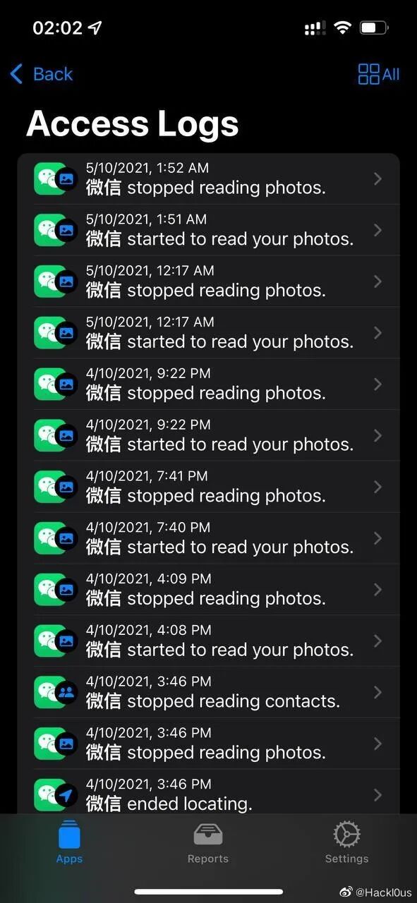此前有网友爆料称,微信会在后台反复读取用户相册的行为。该网友开启了iOS 15 的隐私新特性“记录App活动”,对所有 App 的隐私读取行为进行 7 天的监控,并使用 App Privacy Insights 对记录进行读取。监控发现,微信在用户未主动激活 App 的情况下,在后台数次读取用户相册,每次读取时间长达 1 分钟。(来源:新浪科技)