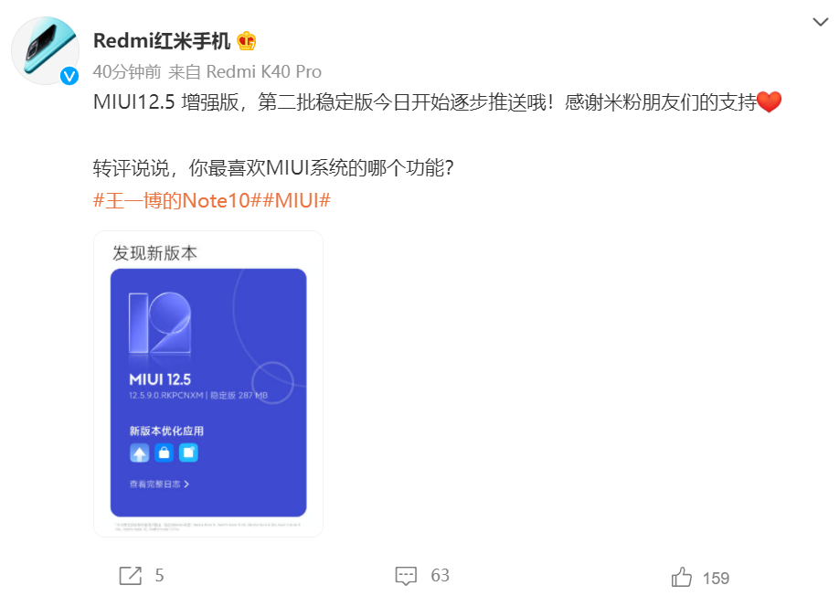 今天,Redmi 红米手机官方微博称,MIUI12.5 增强版第二批稳定版开始逐步推送。本次更新的系统版本为 MIUI 12.5.9 稳定版内测。