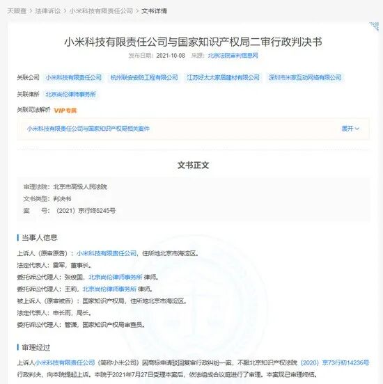 天眼查App显示,10月8日,小米科技有限责任公司与国家知识产权局二审行政判决书公开。