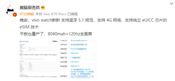 近日,据博主 @熊猫很禿然 消息,vivo 新款智能手表的入网信息流出,该手表将支持 4G 网络。此外,该手表还支持蓝牙 5.1 协议,支持语音功能,支持独立 eUICC 芯片的 eSIM 技术。