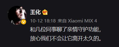 今日,小米公关部总经理王化给大家带来一些好消息,他表示“不会让亲情守护功能离开太久”,暗示有望在停服后一段时间内回归。