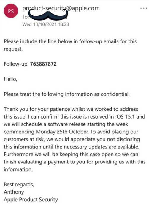 目前,这一 Bug 已在最新的 iOS 15.1 测试版中得到修复,预计下周会推出正式版。也就是说,其他运行 iOS 15.0.2 及更早版本的 iOS 设备仍有可能受到攻击,但目前 iOS 15.1 仅适用于开发人员和公共测试人员。(来源:新浪科技)