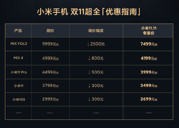 小米官方海报显示,小米 MIX FOLD 降价 2500 元,双 11 专享价为 7499 元起;小米 MIX 4 降价 800 元,双 11 专享价为 4199 元起。另外小米 11 Pro 双 11 专享价为 3999 元起,小米 11 双 11 专享价为 3499 元起,小米 10S 双 11 专享价为 2699 元起。