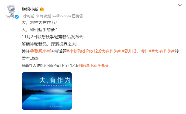 今天,联想小新官方微博宣布,将在 11 月 2 日召开联想秋季轻薄新品发布会,将发布小新 Pad Pro 12.6 等新品。