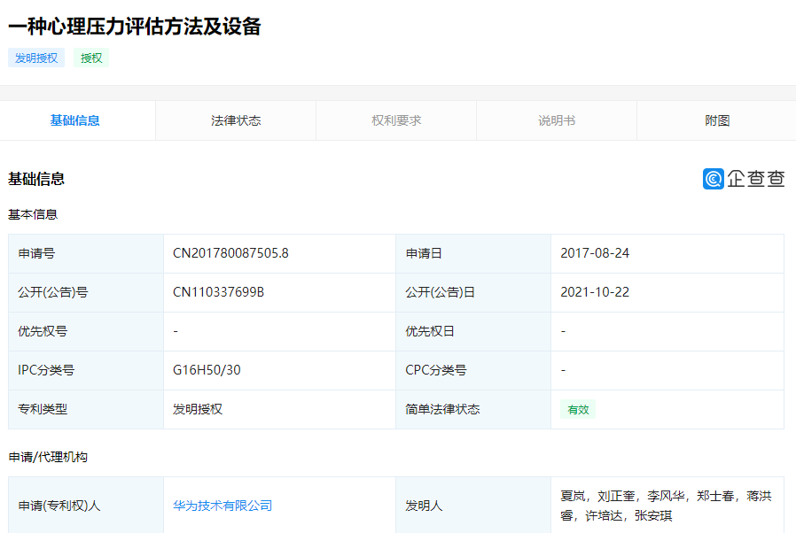 近日,华为技术有限公司公开了“一种心理压力评估方法及设备”专利。