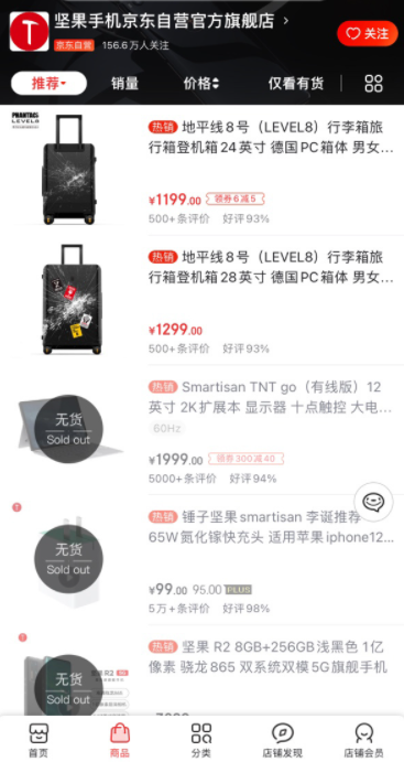 坚果手机京东自营旗舰店显示,店铺现已经下架了坚果手机及充电器等,只剩行李箱为在售状态。