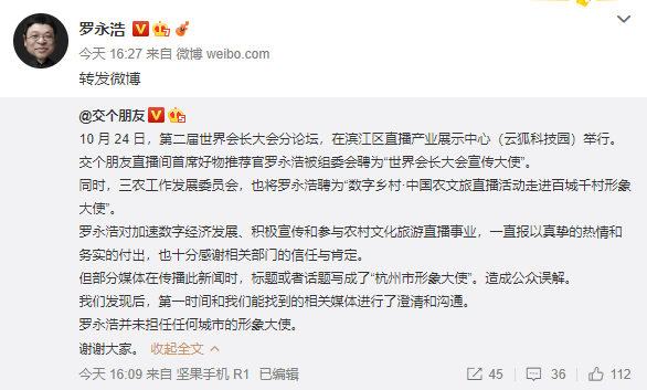 今天下午,“交个朋友”首席主播罗永浩转发交个朋友官方微博文章,文章称关于“罗永浩任杭州市形象大使”的假消息是因部分媒体在传播新闻时将标题或话题写错,造成公众误解。