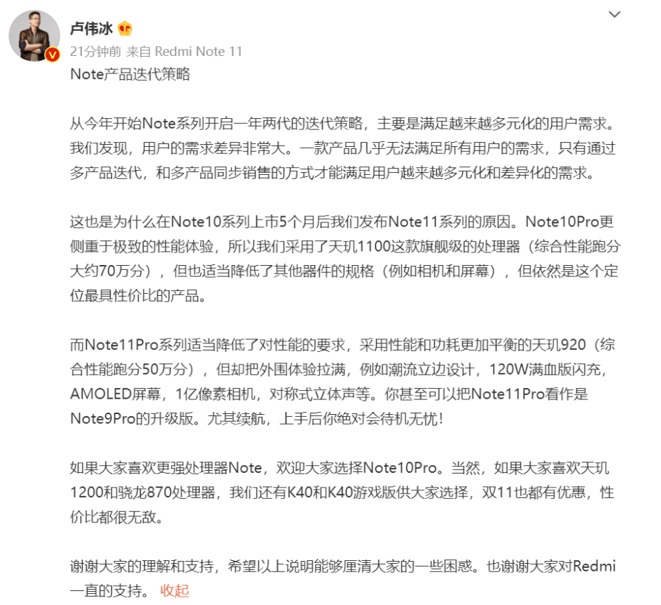 卢伟冰表示,他发现,用户的需求差异非常大。一款产品几乎无法满足所有用户的需求,只有通过多产品迭代,和多产品同步销售的方式才能满足用户越来越多元化和差异化的需求。他还指出,这就是他们在 Note 10 系列上市 5 个月后他们发布 Note 11 系列的原因。