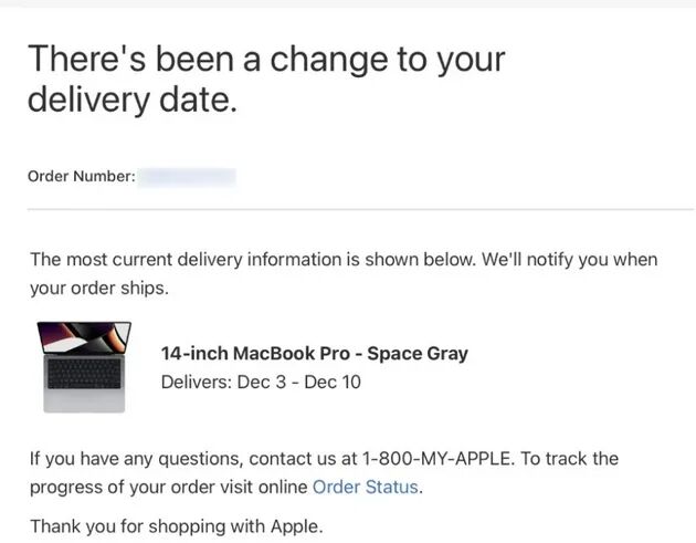 之前,苹果承诺这些用户的订单将于10月26日(今日)发货。但今日,这些用户收到了苹果公司发来的电子邮件,称他们预购的MacBook Pro将于12月发货。