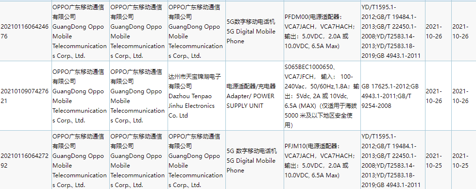 OPPO 近日有多款机型通过了国家 3C 质量认证,例如 PFDM00 和 PFJM10 两款机型支持 65W 快充。