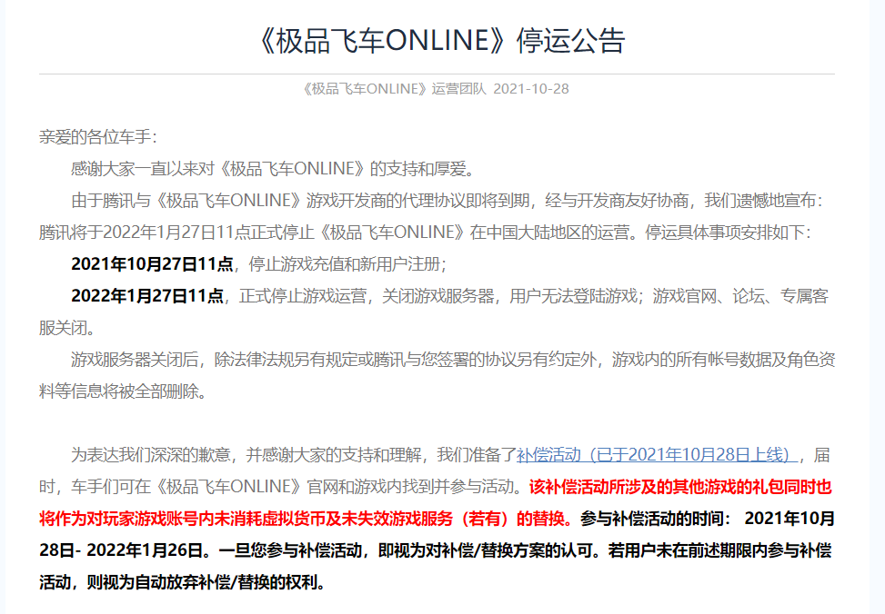 今天,《极品飞车 ONLINE》官方发布公告,由于腾讯与《极品飞车 ONLINE》游戏开发商的代理协议即将到期,腾讯将于 2022 年 1 月 27 日 11 点正式停止《极品飞车 ONLINE》在中国大陆地区的运营。