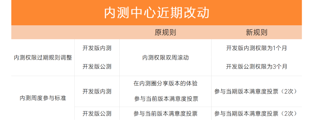 据了解,本次调整将开发版内测权限由原来的双周滚动改为 1 个月,开发版公测权限由双周滚动改为 3 个月。此外,开发版内测周度参与标准由投票与分享体验改为投票两次,开发版内测周度参与标准由投票一次改为投票两次。所有调整将会在 11 月 1 日 0:00 正式开始实施。(来源:IT之家)
