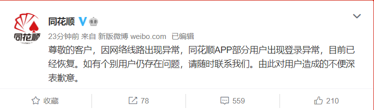 今天上午,据 @同花顺 微博官方发布称,因网络线路出现异常,同花顺 App 部分用户出现登录异常,目前已经恢复。