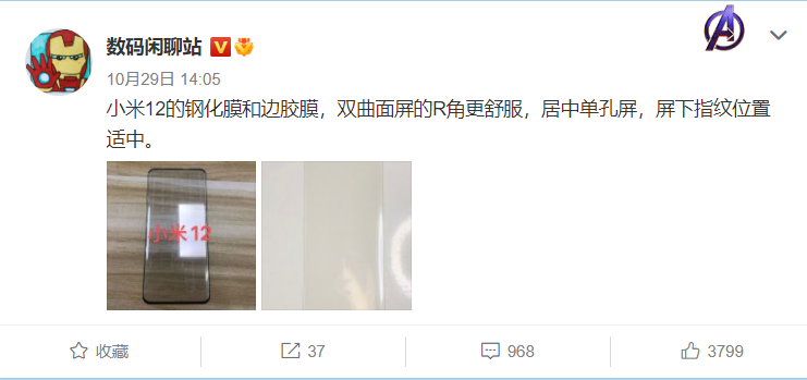 微博博主 @数码闲聊站 近期曝光了小米 12 手机的钢化膜和边胶膜。