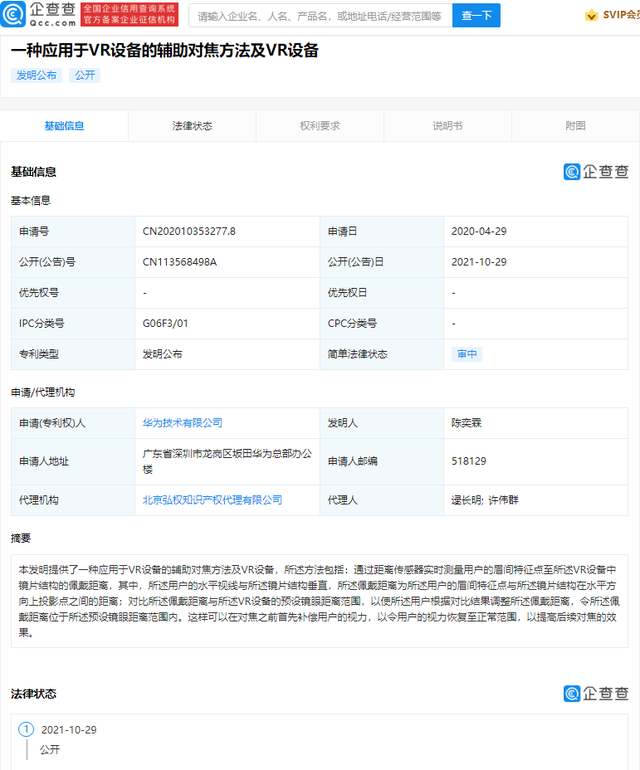 昨日,华为技术有限公司公开“一种应用于 VR 设备的辅助对焦方法及 VR 设备”专利。
