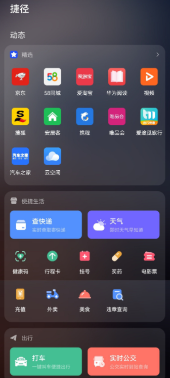 从该博主公布的图片中可以看出,在“荣耀捷径”中,动态栏目包含:精选、便捷生活、出行等板块,除了添加网站和 App 外,还有查快递、查天气、健康码、行程码、充值、外卖等快捷入口。(来源:IT之家)