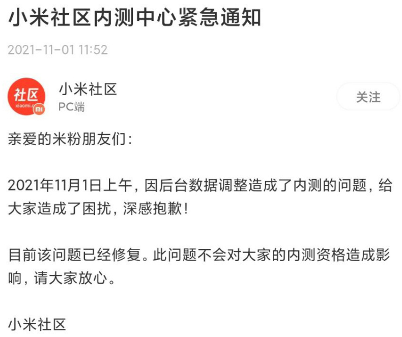 今天中午,小米社区官网发布通知称,今天上午,因后台数据调整造成了内测的问题,目前该问题已经修复。此问题不会对大家的内测资格造成影响。