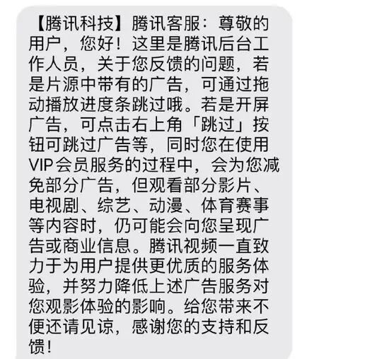 近日,有用户收到腾讯视频客服短信,解释会员也可能呈现广告情况。回应称,若是片源中带有的广告,可通过拖动播放进度条跳过。