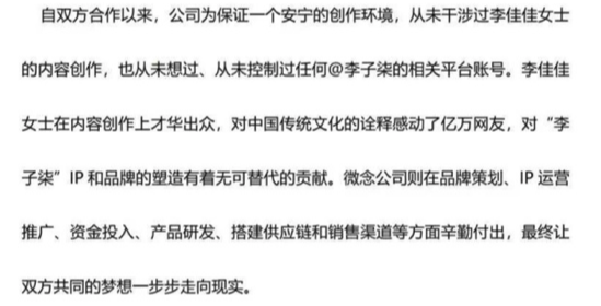 微念对公司与李佳佳在李子柒 IP、品牌方面的分工做了详细的说明。希望与李佳佳就合作内容、合作方式等问题进行持续坦诚的沟通。(来源:IT之家)
