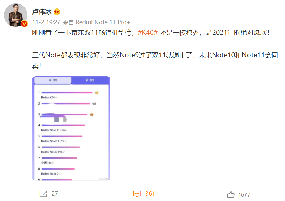 卢伟冰在微博表示,从京东双 11 畅销机型榜来看,“K40 还是一枝独秀,是 2021 年的绝对爆款”。