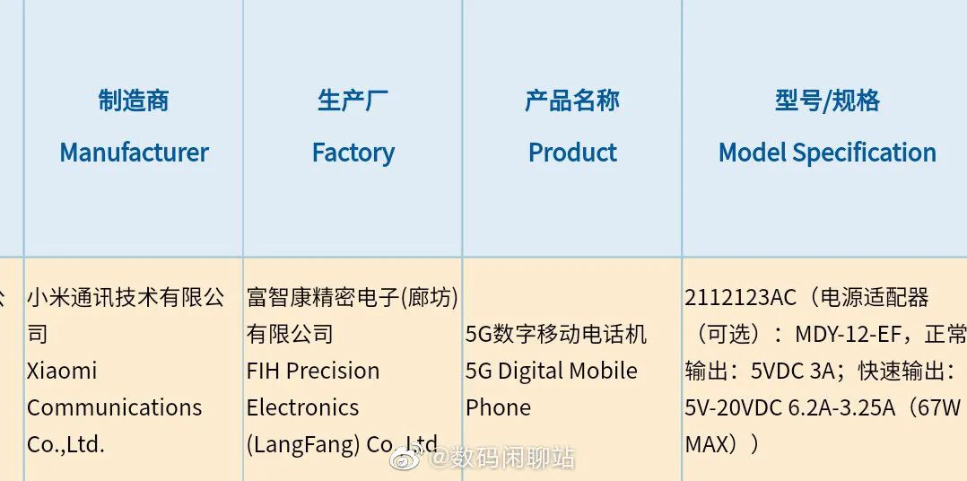 据博主 @数码闲聊站 称,小米有一款代号为“L3AC”新机入网,入网的备案信息显示,该手机的充电器支持 67W 超级快充。