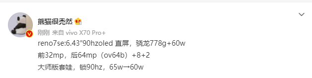 据博主 @熊猫很禿然 最新爆料,OPPO Reno7 SE 新机参数曝光,该手机将搭载骁龙 778G 处理器,支持 60W 充电。