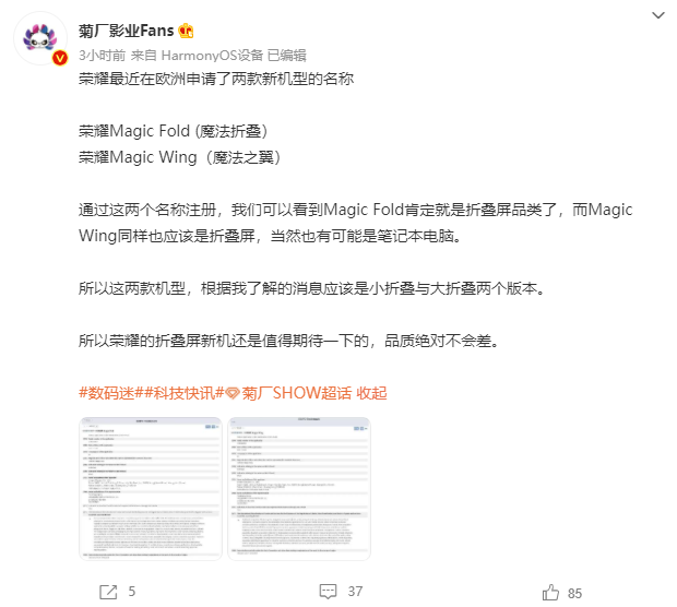 今天,据博主 @菊厂影业 Fans 消息,荣耀最近在欧洲申请了两款新机型的名称,分别为:“Magic Fold”和“Magic Wing”。