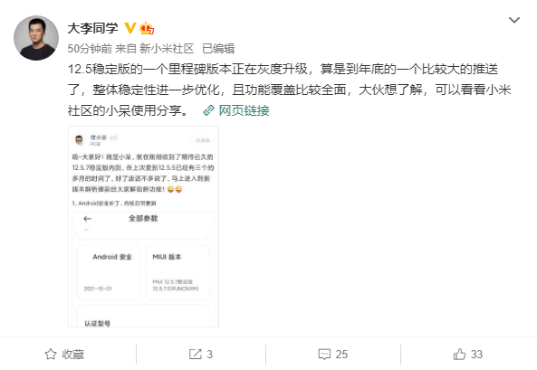 昨天,小米高管李明透露,MIUI 12.5 稳定版的一个里程碑版本(12.5.7.0.RJNCNXM)正在进行灰度升级。他表示这个版本是 MIUI 到年底之前的一个比较大的推送,整体稳定性进一步优化,且功能覆盖比较全面。