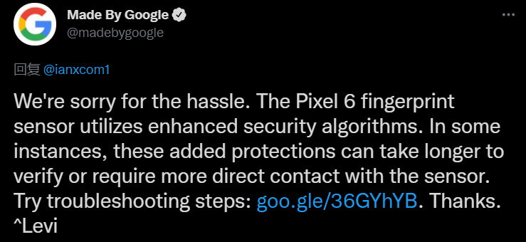 谷歌表示:我们很抱歉给您带来麻烦。Pixel 6 系列的指纹传感器采用增强的安全算法,在某些情况下,这些附加保护可能需要更长的时间来验证或需要与传感器进行更直接的接触。