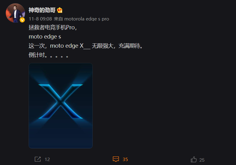 今日,联想中国区手机业务部总经理 @神奇的劲哥 宣布,将推出 moto edge X 新机,并号称“无限强大,充满期待”。