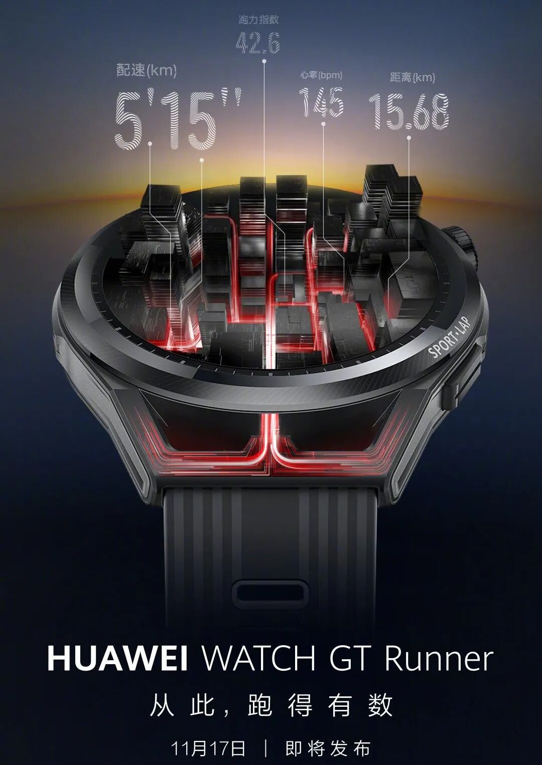 从华为 Watch GT Runner 的宣传海报来看,该手表采用圆形屏幕设计,在边框上刻有“SPORT-LAP”字样,并且该手表可以显示运动者的配速、跑力指数、心率、距离等一系列运动数据。“从此,跑得有数”。