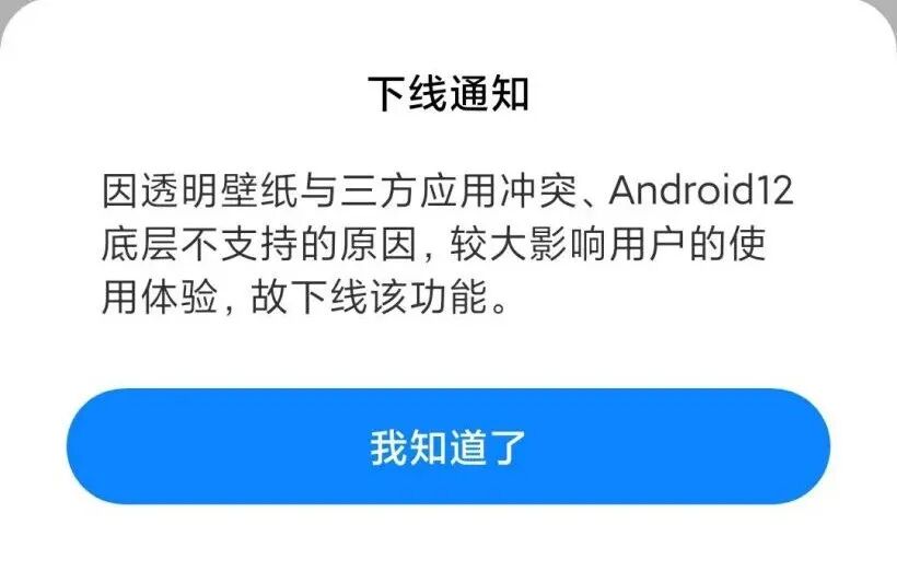 下线通知显示:因透明壁纸与三方应用冲突、Android 12 底层不支持的原因,较大影响用户的使用体验,故下线该功能。