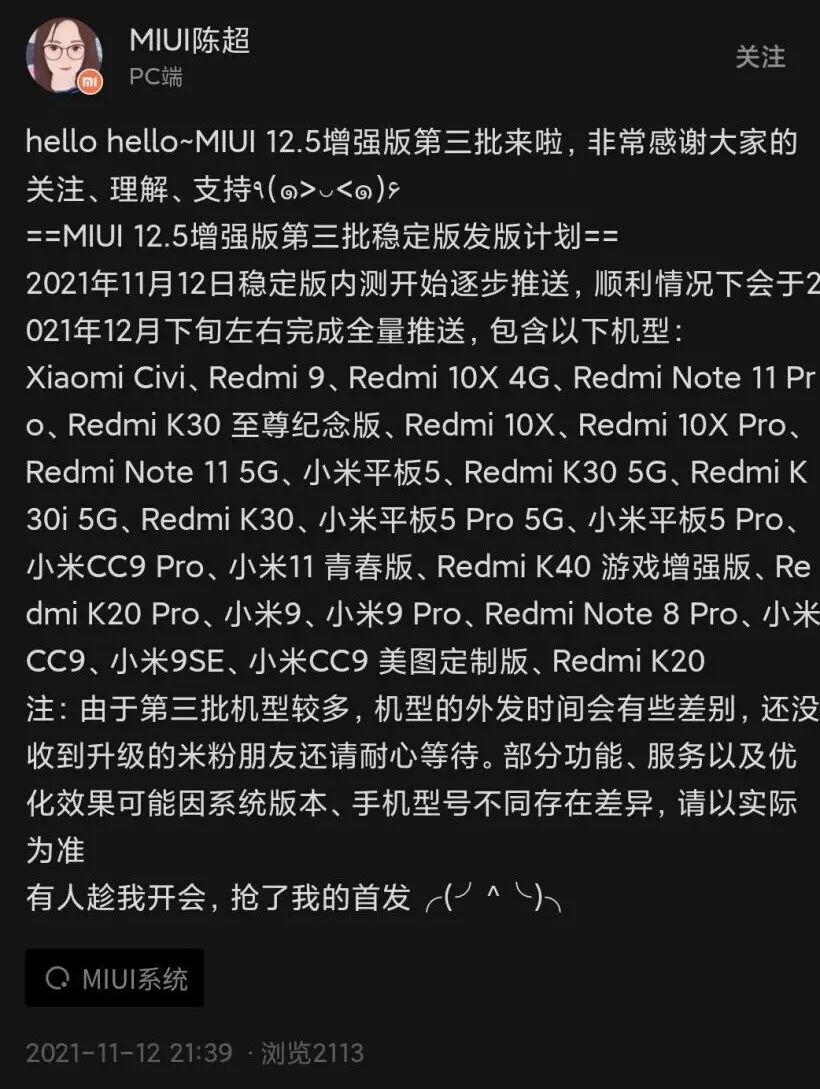11 月 12 日,据小米官方人员发布,MIUI12.5 增强版第三批稳定版发版计划来了。