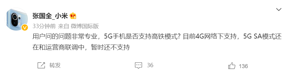 针对用户提出的“5G 手机是否支持高铁模式”的问题,小米手机系统软件部总监张国全今日上午通过社交媒体表示,目前 4G 网络下支持,5G SA 模式还在和运营商联调中,暂时还不支持。