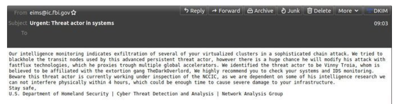 根据跟踪垃圾邮件和相关网络威胁的非营利组织 Spamhaus Project 提供的信息,黑客使用 FBI 的电邮账号发送了数万封电子邮件,就可能发生的网络攻击发出警告。这次攻击事件始于纽约时间周六午夜,随后的活动从凌晨 2 点开始。该组织预计,黑客发送的垃圾邮件最终到达了至少 10 万个邮箱中。