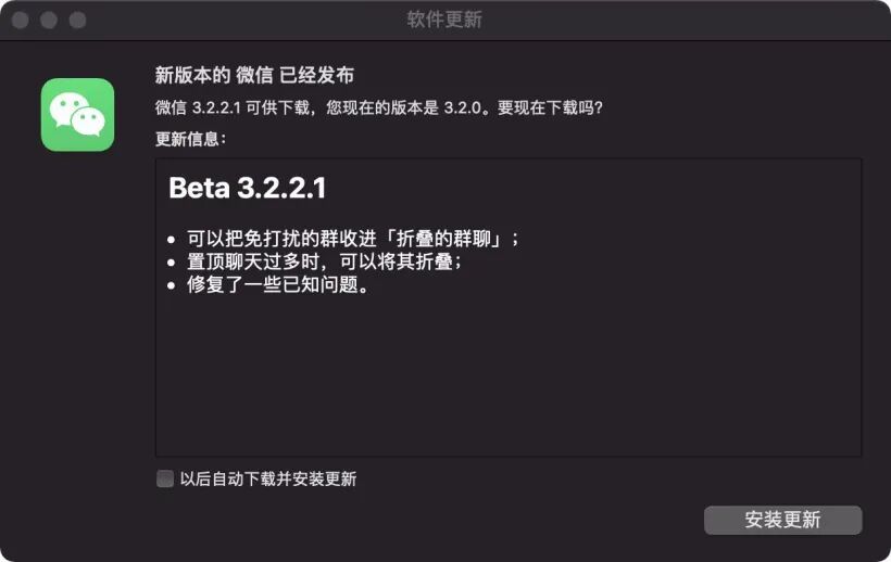 今天腾讯微信团队推送发布了微信 macOS 版 3.2.2.1 Beta 应用更新,带来了新功能。