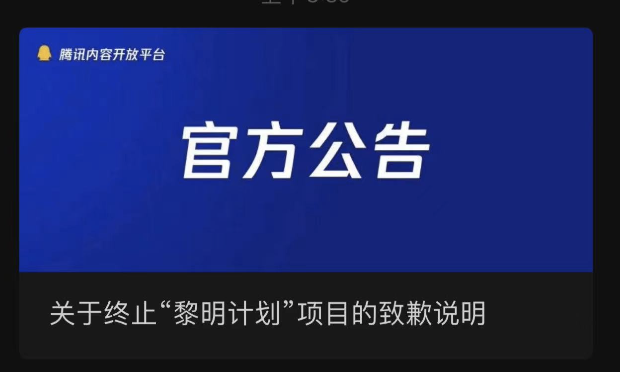,腾讯内容开放平台发文,称因执行中管理不严及产品设计不完善,导致了不少问题,决定终止“黎明计划”,并向UP主们道歉。
