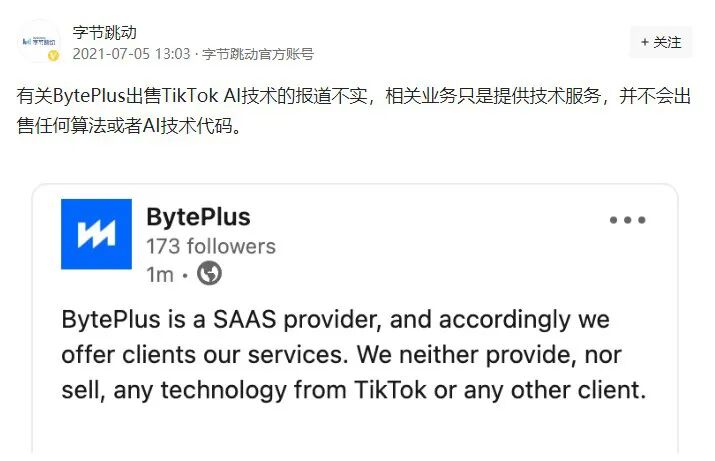今日字节跳动在其官方头条号辟谣称,有关 BytePlus 出售 TikTok AI 技术的报道不实,相关业务只是提供技术服务,并不会出售任何算法或者 AI 技术代码。