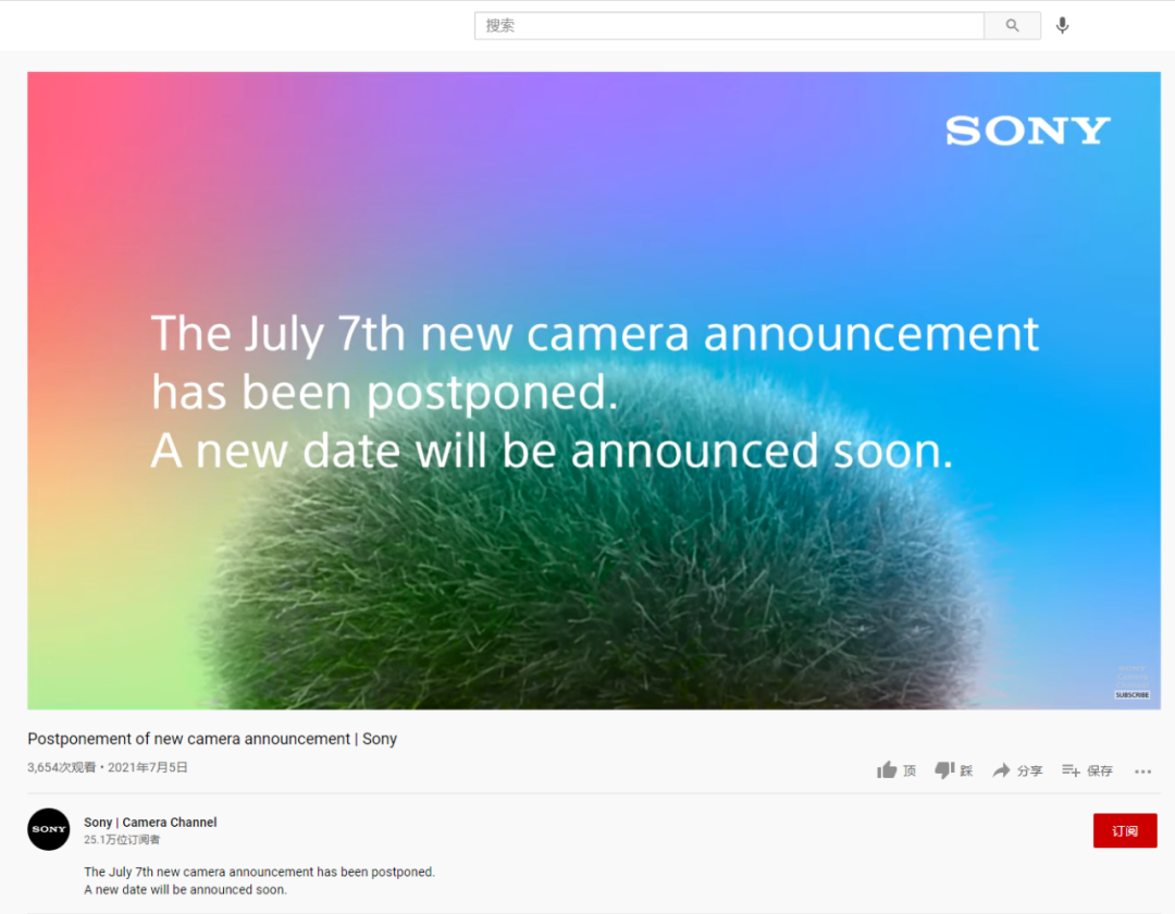 索尼公司在其 YouTube 频道 Sony | Camera Channel 上宣布:7 月 7 日的全球相机新品发布会将延期举行,新日期随后公布。