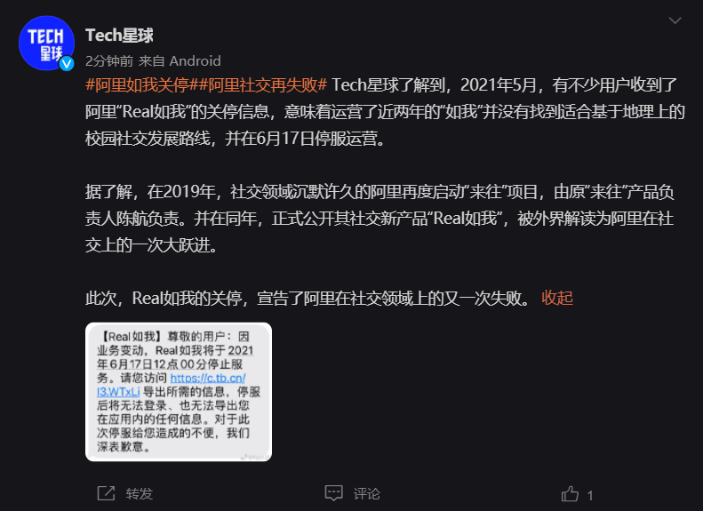 今年 5 月份,不少用户收到了阿里巴巴“Real 如我”的短信通知,该主打真实社交的平台于 6 月 17 日停止服务。