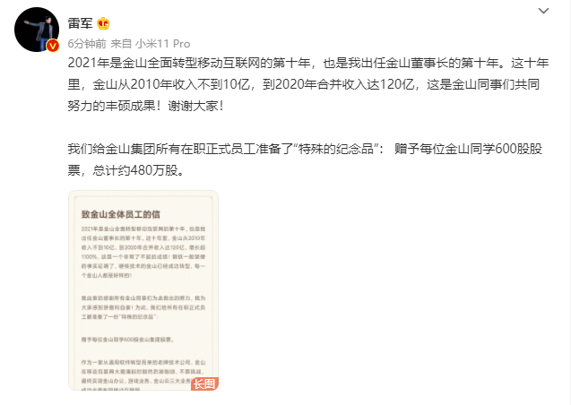 今年是雷军出任金山集团董事长的第十年,今日,雷军发微博表示,为金山集团所有在职正式员工准备了“特殊的纪念品”,赠予金山员工每人 600 股股票。