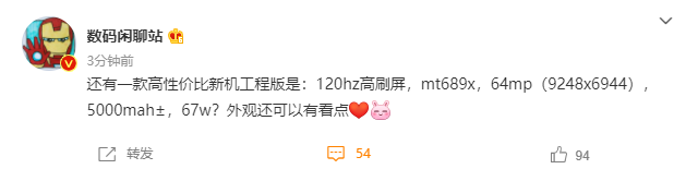 7 月 6 日消,据博主 @数码闲聊站 今日消息,Redmi 有一款新机的工程版被曝光,该手机将主打高性价比,支持 120Hz 高刷新率,拥有 5000mAh 电池,并且还支持 67W 快充。