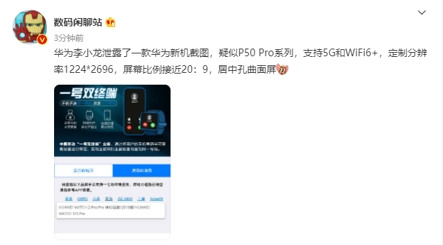 华为 P50 Pro 手机可能将支持 5G 和 WiFi6+,定制分辨率 1224*2696,屏幕比例接近 20:9,采用居中孔曲面屏设计。