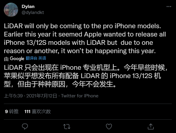 知名爆料者 @DylanDKT 今天发推表示,今年的 iPhone 13(或 12s) 系列只有 iPhone 13 Pro 和 iPhone 13 Pro Max 才支持激光雷达扫描仪,入门级的 iPhone 13 和 iPhone 13 mini 依然没有。