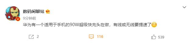 据博主 @数码闲聊站 今日爆料,华为正在做适用于手机的 90W 超级快充头,其有线或无线充电速度将迎来大升级。