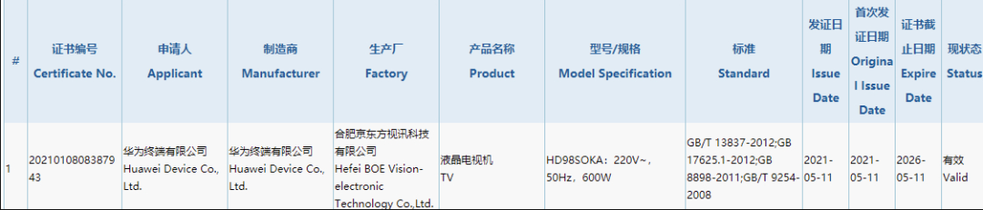 此外,该博主还爆料了智慧屏 V98 的入网信息,智慧屏 V98 的型号为 HD98SOKA ,该设备由合肥京东方视讯科技有限公司生产,尺寸为 98 英寸,最高 600W 供电。(来源: IT之家)