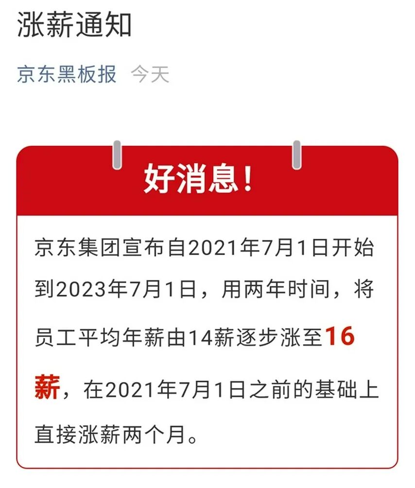 今天京东集团宣布,自2021年7月1日开始到2023年7月1日,用两年时间,将员工平均年薪由14薪逐步涨至16薪,在2021年7月1日之前的基础上直接涨薪两个月。