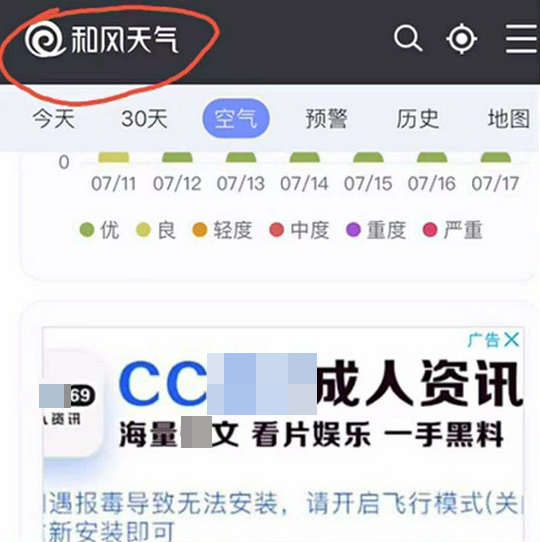 “和风天气”技术支持人员表示,他们的广告审查是不定期的,广告主投放的内容存在(审查)后置问题,也就是事先不会经过人工筛查,出现类似违规广告才会跟进解决。目前开发了自动屏蔽的功能按钮,正在测试中。由于版本问题,也不能做到完全屏蔽,“所以,看到这种广告最好不要点开”。(来源:新浪科技)